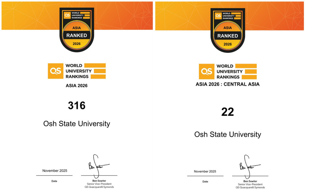 Dual degree programs with international partners have expanded significantly. In the QS Sustainability Rankings, which included 2,022 universities, Osh State University was ranked 1251st for environmental and social impact and 1107th for governance, placing it overall in the TOP 1500 universities worldwide.